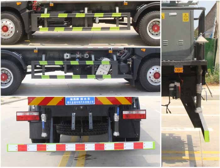 該車主要用于城鄉園林綠化噴灑作業;主要裝置為水罐及噴灑裝置;罐體總容量:10.7立方米;罐體有效容積:10.2立方米;罐體外形尺寸(長×長軸×短軸)(mm):4800×2300×1300.ABS系統生產廠家,型號:焦作博瑞克控制技術有限公司,J ABS;襄陽東風隆誠機械有限責任公司,ABS/ASR-24V-4S/4M.側、后防護材料均為:Q235碳鋼,連接方式均為:螺栓連接,后部防護截面尺寸(mm):120×50,后部防護離地高度(mm):480.隨底盤選裝限速裝置,限速89km/h.隨底盤選裝燃油箱,電瓶,尿素罐,儲氣筒左右安裝位置,選裝噴霧裝置樣式.選裝箭頭燈裝置,選裝前部電子水炮裝置樣式,選裝前部不帶電子水炮;當前部帶電子水炮時,前伸500mm,整車長度為9100mm,8550mm;當前部不帶電子水炮時,前伸為0mm,整車長度為8600mm,8050mm.選裝罐體頂部高位花灑裝置及方形罐口,選裝尾部自流口裝置,選裝工具箱.采用底盤4500mm軸距改裝.后軸僅采用鋼板彈簧懸架.
