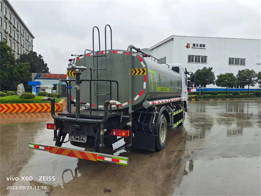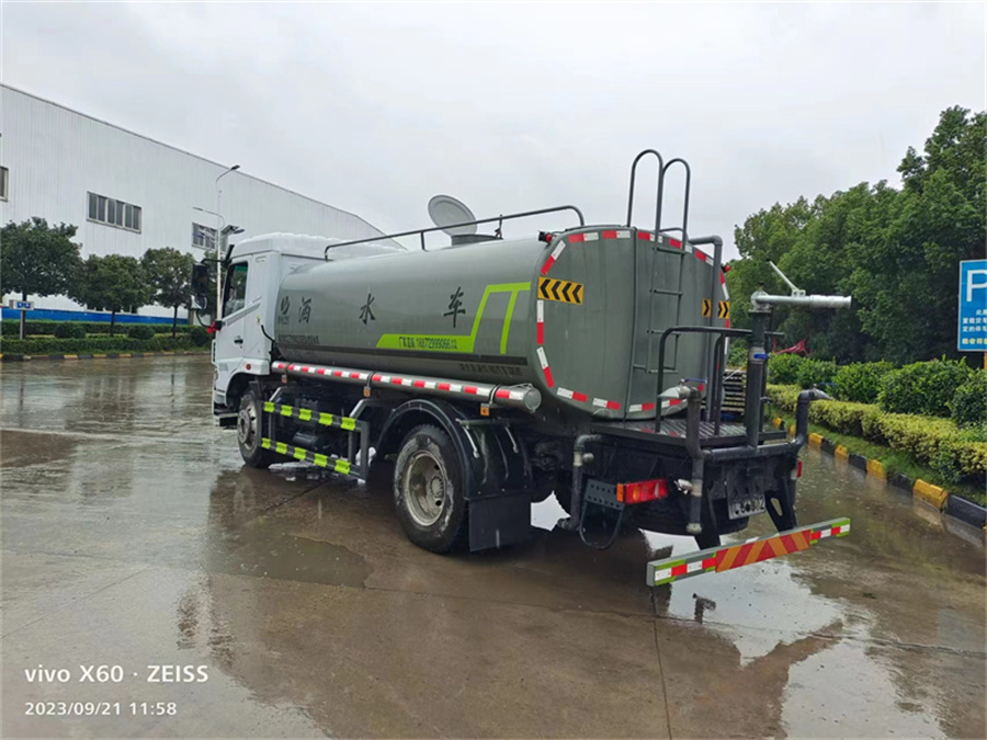 東風12噸灑水車產品標配前噴(鴨嘴)、后沖、后灑、側噴、后置式工作平臺,平臺上配置綠化水炮(可 360°旋轉,既可以調成柱狀,也可以調成霧狀,更可以調成直沖狀、大雨、中雨、小雨、毛毛雨),配備優質大功率專用灑水泵(可自吸自排,可從河里或池塘抽水到罐體),取力器,雜物過濾網,消防接口,自流球閥系統、取力器、球閥、濾網均為國家標準產品,