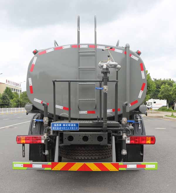 該車主要用于城鄉園林綠化噴灑;主要裝置為罐體及噴灑裝置;隨底盤選裝駕駛室,罐體總容量:11立方米;罐體有效容積:10.9立方米;罐體外形尺寸(長×長軸×短軸)(mm):3700×2400×1540;ABS控制器型號為CM4XL-4S/4M,ABS控制器生產企業為廣州瑞立科密汽車電子股份有限公司;側、后防護材料均為:Q235碳鋼,連接方式均為:螺栓連接,后部防護截面尺寸(mm):120×50,后部防護離地高度(mm):450.采用3950mm軸距.選裝電瓶,油箱出口位置,選裝擋泥板樣式。選裝側部及后部樣式時,后部防護為專用裝置代替,離地高度為450mm。