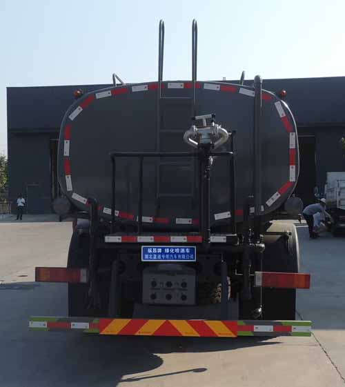 該車主要用于城鄉園林綠化噴灑;主要裝置為罐體及噴灑裝置;隨底盤選裝駕駛室,罐體總容量:11.03立方米;罐體有效容積:10.5立方米;罐體外形尺寸(長×長軸×短軸)(mm):5000×2350×1600,5000×2350×1520;ABS型號及生產廠家為:3631010-C2000/東科克諾爾商用車制動系統(十堰)有限公司,J ABS/焦作博瑞克控制技術有限公司;側、后防護材料均為:Q235碳鋼,連接方式均為:螺栓連接,后部防護截面尺寸(mm):120×50,后部防護離地高度(mm):450.采用4500mm軸距.選裝電瓶,油箱出口位置,選裝噴灑裝置樣式。選裝后部箭頭燈,選裝后部弧形噴灑裝置,選裝水炮支架位置,選裝高位花灑管道樣式。選裝自動球閥安裝位置,選裝大工作平臺。選裝無高位花灑。隨底盤選裝后尾燈樣式。