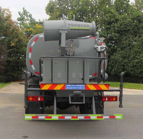 該車主要用于城鄉園林綠化噴灑;主要裝置為罐體及噴霧裝置;罐體總容量:11.61立方米,罐體有效容積:11.05立方米,罐體外形尺寸(長×長軸×短軸)(mm):5000×2350×1600,5000×2350×1520;ABS型號/生產廠家:3631010-C2000/東科克諾爾商用車制動系統(十堰)有限公司,ABS 8/東科克諾爾商用車制動系統(十堰)有限公司,4460046450/威伯科汽車控制系統(中國)有限公司,J ABS/焦作博瑞克控制技術有限公司;側、后防護材料均為:Q235碳鋼,連接方式均為:螺栓連接,后部防護截面尺寸(mm):120×50,后部防護離地高度(mm):480.隨底盤選裝駕駛室,選裝油箱安裝位置;選裝噴霧裝置樣式.采用4700mm,4500mm軸距.選裝限速裝置,限速89.選裝弧形噴霧裝置,選裝箭頭燈裝置,選裝水炮支架位置,選裝高位花灑管道樣式,選裝前部自動炮樣式,前伸500mm,整車長度為9150,9000(mm)。