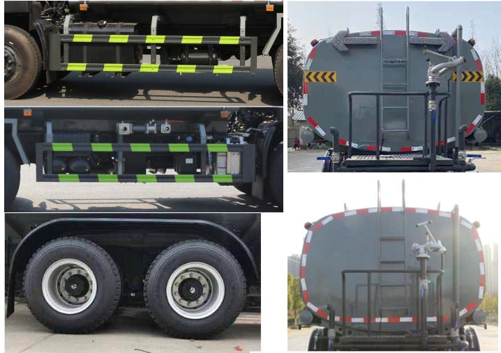 該車主要用于城鄉園林綠化噴灑;主要裝置為罐體及噴灑裝置:罐體總容積:14.81立方米;罐體有效容積:14.1立方米;罐體外形尺寸(長×長軸×短軸)(mm):6800×2390×1620;側、后防護材料均為:Q235碳鋼,連接方式均為:螺栓連接,后部防護截面尺寸(mm):120×50,后部防護離地高度(mm):480;ABS型號/生產廠家:3631010-C2000/東科克諾爾商用車制動系統(十堰)有限公司,ABS 8/東科克諾爾商用車制動系統(十堰)有限公司,4460046450/威伯科汽車控制系統(中國)有限公司.采用4350+1350(mm)軸距.隨底盤選裝限速裝置,限速89km/h.隨底盤選裝駕駛室,選裝噴霧裝置樣式。選裝蓄電池及儲氣筒位置.選裝擋泥板樣式,選裝后部樣式,選裝弧形噴灑裝置,選裝箭頭燈裝置,選裝水炮支架位置,選裝自動球閥安裝位置。