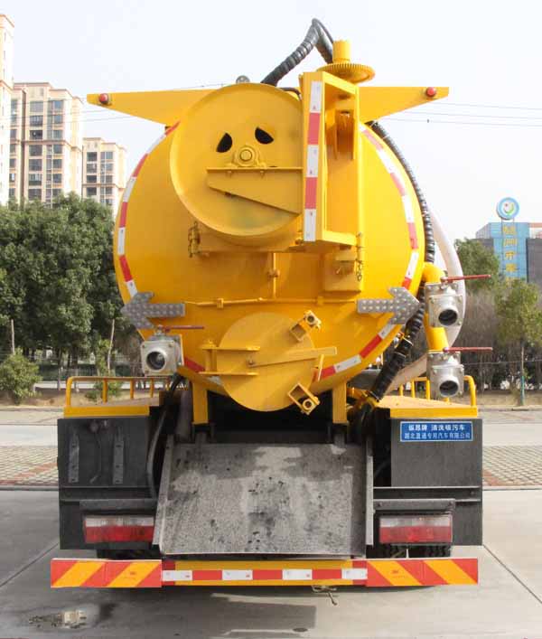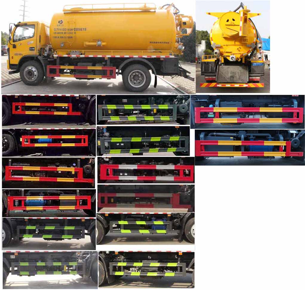 該車用于下水道排污及疏通,專用裝置:罐體、吸污泵、清洗沖刷總成.該車輛具有舉升功能,罐體外形尺寸(罐體總長×直徑)(mm):4900×1750(前面1600mm為清水罐,后部3300mm為污水罐);污水罐總容量:6.91立方米,污水罐有效容積:6.58立方米,介質:液態污物,密度800千克/立方米;清水罐有效容積:3.6立方米,介質:水,密度1000千克/立方米;清水罐和污水罐為獨立罐體,清洗功能時用清水罐,吸污功能時用污水罐,污水罐和清水罐不可同時滿載,兩罐不可同時使用.ABS型號/廠家:ABS型號:ABS/ASR-24V-4S/4M,廠家:襄陽東風隆誠機械有限責任公司;側、后防護材料均為:Q235碳鋼,側、后防護均為螺栓連接,后部防護截面尺寸(mm):120×50,后部防護離地高度(mm):380;僅采用底盤3800mm軸距改裝.隨底盤選裝駕駛室,選裝后部出口樣式,選裝側面樣式.隨底盤選裝車速89km/h.選裝油箱電瓶安裝位置.選裝后部樣式.
