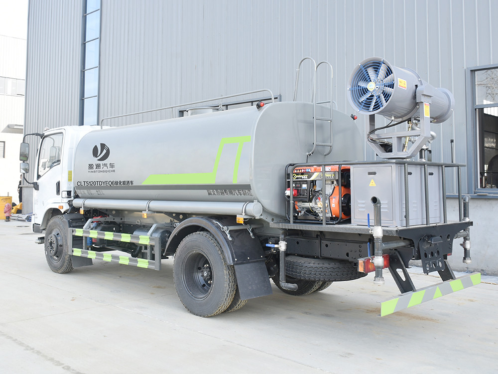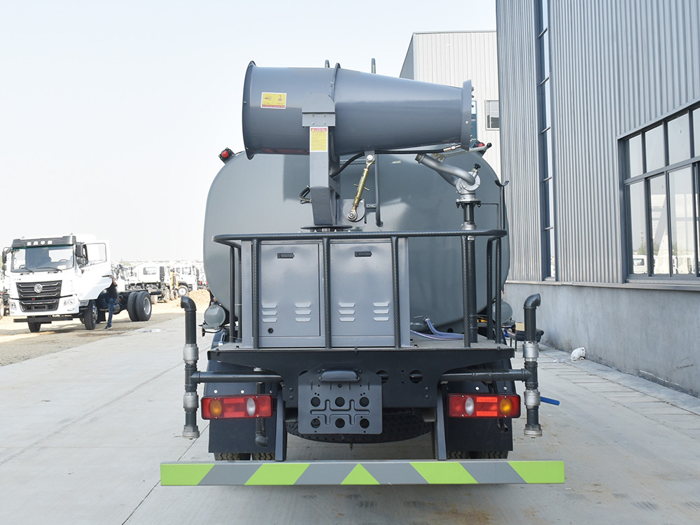 東風10方抑塵灑水車配置: 發動機云內 150 馬力(四缸),萬里揚 6 檔變速箱,前橋 2.2 噸, 后橋 4.2 噸,8.25 鋼絲胎,軸距 3800,斷氣剎,ABS,空調,電動玻璃, 中控鎖。2.上裝配置: 1、罐體約為 10 方,可加裝 30 型霧炮 2、邊燈帶電,罐體尾部上方標配 2 個紅色示寬燈, 3、標配前噴為鴨嘴直沖,標配后沖,用戶可根據自己的需求,來調 整對沖位置。 4、花紋防滑平臺,炮筒后蓋為定制型螺栓卡扣, 5、前噴、后沖、后灑、側噴,綠化高炮開關球閥均采用 50 大通經 不銹鋼球閥, 6、新式軸承式水炮,更加耐用, 7、40-50 型水泵, 8、防腐法蘭墊片, 9、鋁制后灑,不易炸開 10、罐體自動焊(美國林肯焊機及電源),拼板自動焊接,封頭環 縫焊接,無氣孔,焊縫美觀。 11、側護網、后保險杠、均為螺栓連接,方便拆卸,維修方便。 12、塑料擋泥板,替代鐵擋泥板,更加輕便,用螺栓連接,方便拆 卸。 13、前部、后部主管連接處為 6 孔圓法蘭,不易沖墊