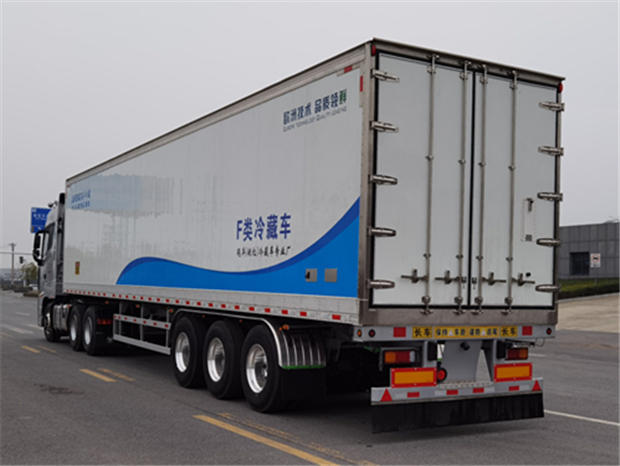 半掛冷藏車基礎配置為:13噸3軸富華橋(鋼板式),鋁合金輪圈,16噸剎車片,側防護為鋁合金材質。1、外全鋁蒙皮,內熱塑板,左右側板8公分厚,底板12公分厚,底板加厚通風槽、箱體內部頂板加裝通風布,單側門,行走部分為13噸3軸富華橋(鋼板式),二個備胎架,鋁護欄,鋁保險杠,鋁工具箱,鋁氣罐,托盤,約斯特雙聯動支腿、雙錢輪胎、左右兩側30-40公分護板(圍裙),后馬蹄焊連,大包邊,后門雙杠,其他按掛車標準。