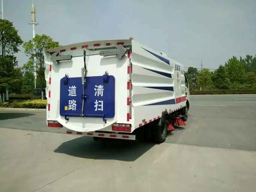 該掃路車采用東風(fēng)多利卡型國(guó)五二類底盤(pán)改裝,加裝副發(fā)動(dòng)機(jī)、風(fēng)機(jī)、清水箱、垃圾箱、左右立掃、后置吸盤(pán),掃盤(pán)降塵系統(tǒng),液壓系統(tǒng)、專用裝置電控系統(tǒng)和副車架等改裝而成(可加裝前沖后灑)