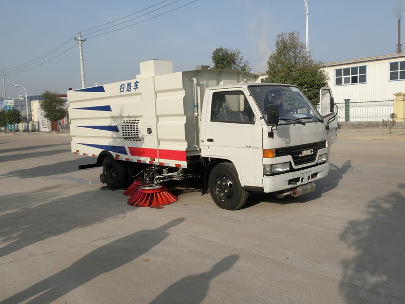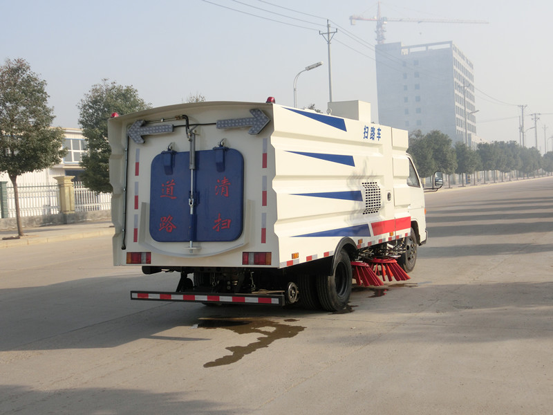 該掃路車采江鈴國五二類底盤改裝,加裝副發(fā)動機(jī)、風(fēng)機(jī)、清水箱、垃圾箱、左右立掃、后置吸盤,掃盤降塵系統(tǒng),液壓系統(tǒng)、專用裝置電控系統(tǒng)和副車架等改裝而成(可加裝前沖后灑)