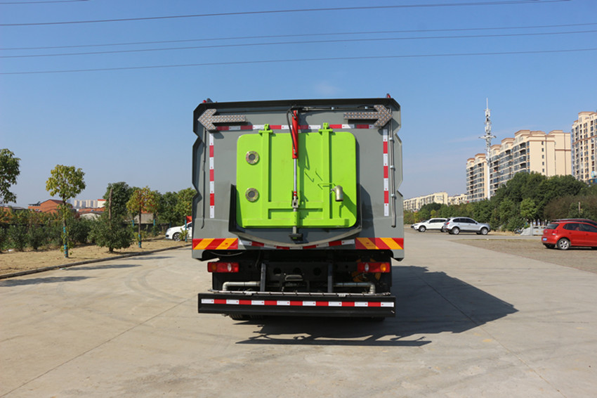 Ø 清水箱充分利用了車載空間,容積大,容積達9m3。垃圾箱采用單層304不銹鋼結構,傾翻卸料,帶高壓自潔裝置。自潔裝置可在垃圾箱卸料時幫助卸料,清洗垃圾箱內部。