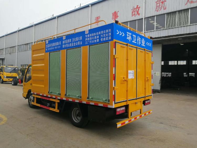 底盤型號(hào):EQ1041SJ3BDF,發(fā)動(dòng)機(jī)玉柴YC4FA115-50,7.00R16鋼絲胎,帶動(dòng)轉(zhuǎn),氣剎,方向助力,整車顏色工程黃。 上裝配置:18.5千瓦電機(jī)1臺(tái),配電柜1臺(tái),4寸排污泵一臺(tái),5.5KW水循環(huán)真空泵1臺(tái),3方高壓水箱,1.5立方液壓絞龍式/滾筒式污水分離箱,帶高壓清洗功能,采用意大利普蘭索特16MPA高壓泵,箱體材質(zhì)采用熱板制作,后部帶LED屏,配工具箱一個(gè)。100mm吸污管4根(每根6米),60米Ф19mm的高壓管,帶10個(gè)噴頭。