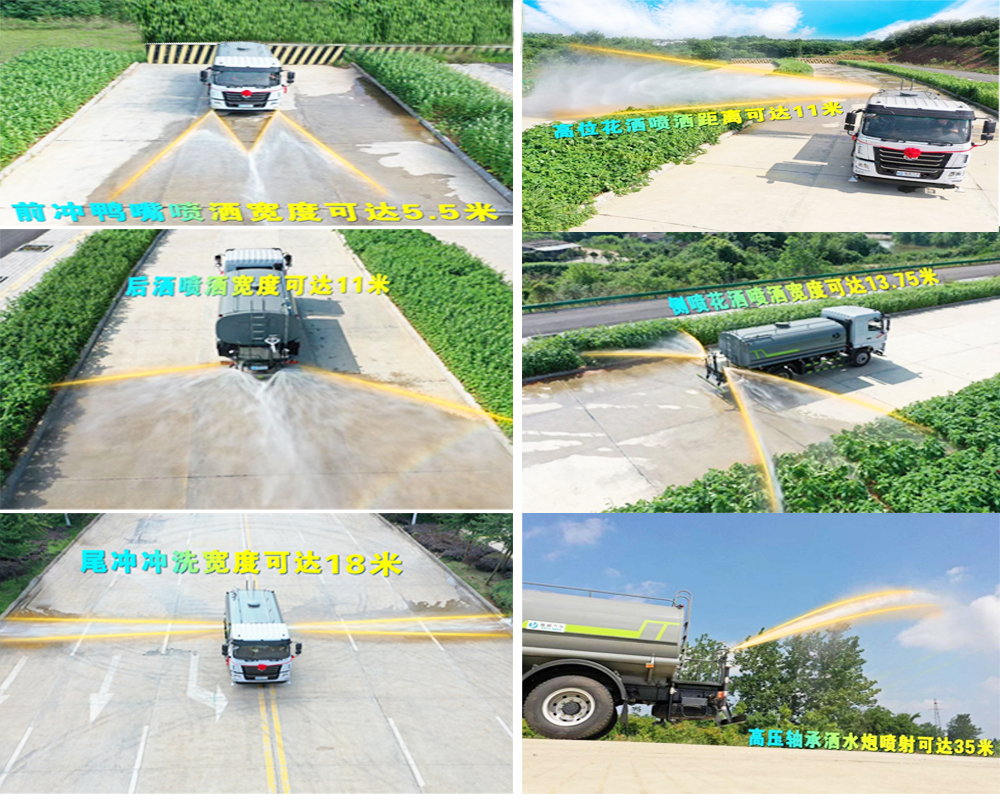 罐體實(shí)際容積約為9.35立方米,采用武鋼優(yōu)質(zhì)碳鋼板卷壓成型。配備專用灑水泵,自吸自排,前噴后灑、側(cè)噴、后工作平臺及灑水高壓炮。灑水泵自吸高度為6米左右,整車灑水寬度14米左右,后工作平臺水炮可調(diào)成:直沖狀、大雨、中雨、小雨、霧狀,有效射程≥28米,整車帶接頭、水位計(jì),自流閥。后工作平臺主管道有一個(gè)一寸的澆花接口,附送2根3米水管,1個(gè)爬梯,兩側(cè)及后保險(xiǎn)杠。