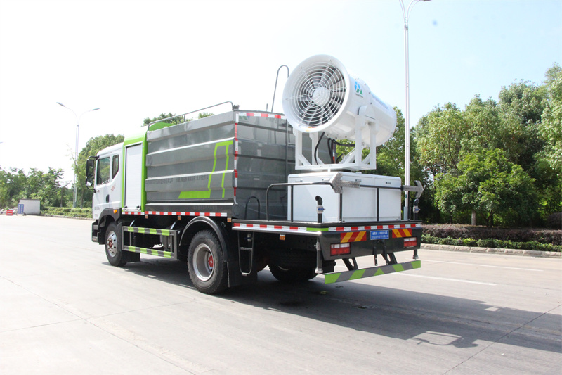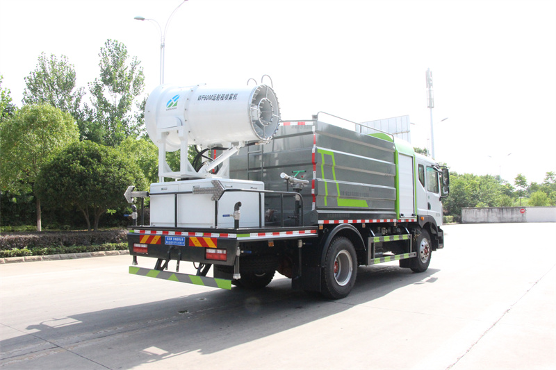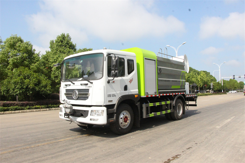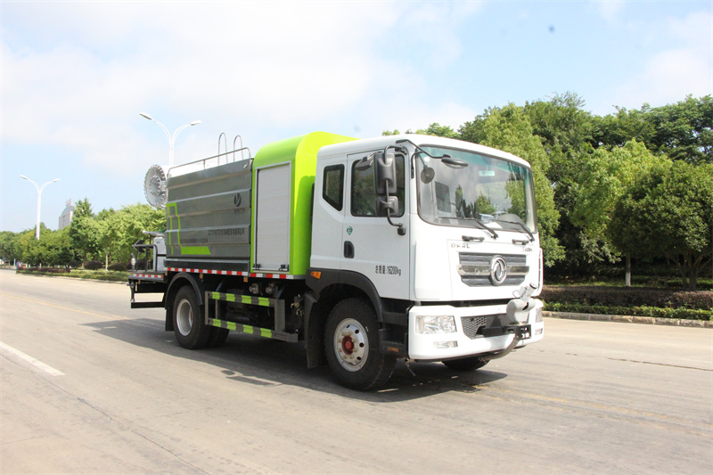 東風12方大型霧炮灑水車產品簡述:縱昂牌 CLT5181TDYEQ6A 型多功能抑塵車標配前噴(鴨嘴)、后 對沖、后灑、側噴、后置式工作平臺,平臺上配置綠化水炮(可 360°旋轉,既 可以調成柱狀,也可以調成霧狀),配備優質大功率專用灑水泵(可自吸自排, 可從河里或池塘抽水到罐體),取力器,雜物過濾網,消防接口,自流球閥系統、 取力器、球閥、濾網均為國家標準產品,主管道加粗,法蘭墊、法蘭盤加厚, 大通徑球閥。整體具備性能優良安全可靠、效率高、流量大、維修方便等特點