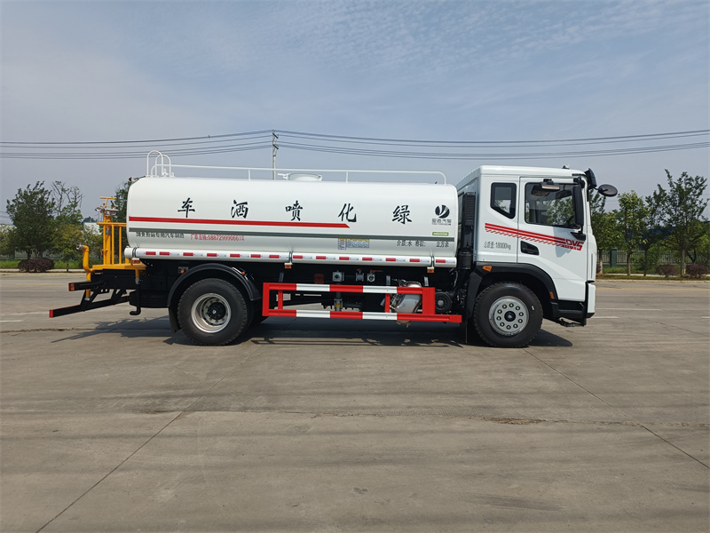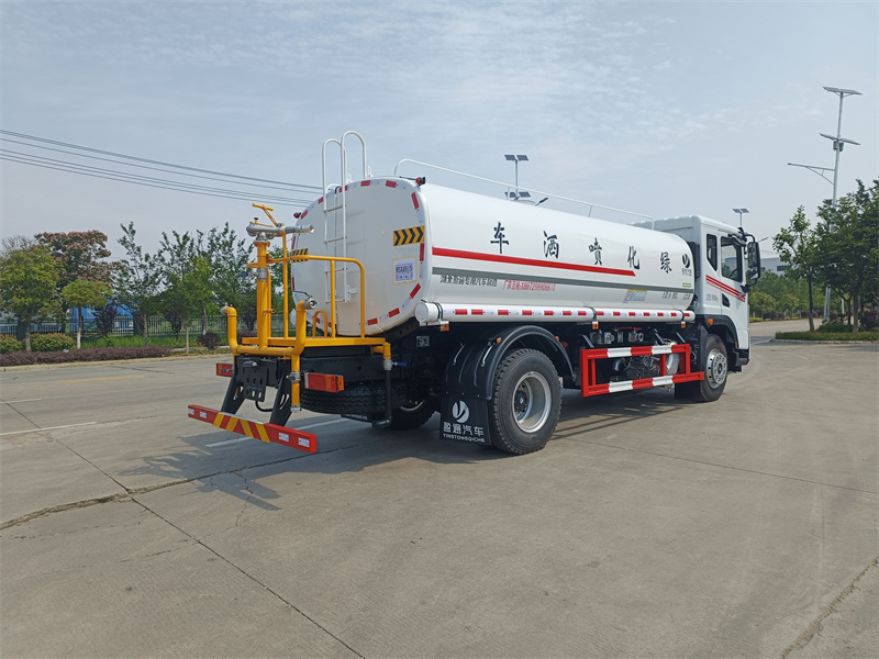東風15方灑水車產品標配前噴(鴨嘴)、后沖、后灑、側噴、后置式工作 平臺,平臺上配置綠化水炮(可360°旋轉,既可以調成柱狀,也可 以調成霧狀,更可以調成直沖狀、大雨、中雨、小雨、毛毛雨),配 備優質大功率專用灑水泵(可自吸自排,可從河里或池塘抽水到罐體), 取カ器,雜物過濾網,消防接口,自流球閥系統、取カ器、球閥、濾網 均為國家標準產品,主管道加粗,法蘭墊、法蘭盤加厚,大通徑球閥。 整體具備性能優良安全可靠、效率高、流量大、維修方便等特點。