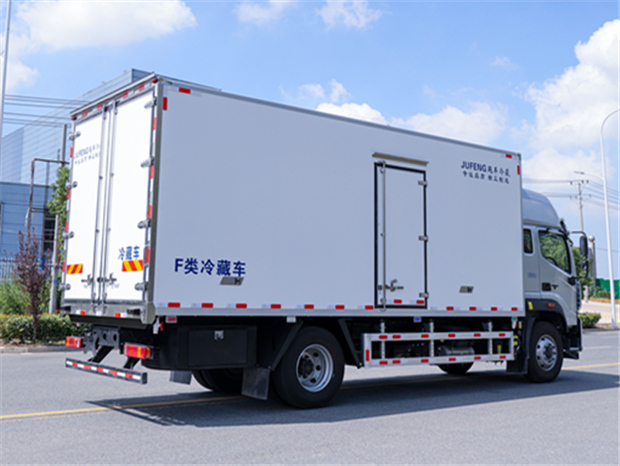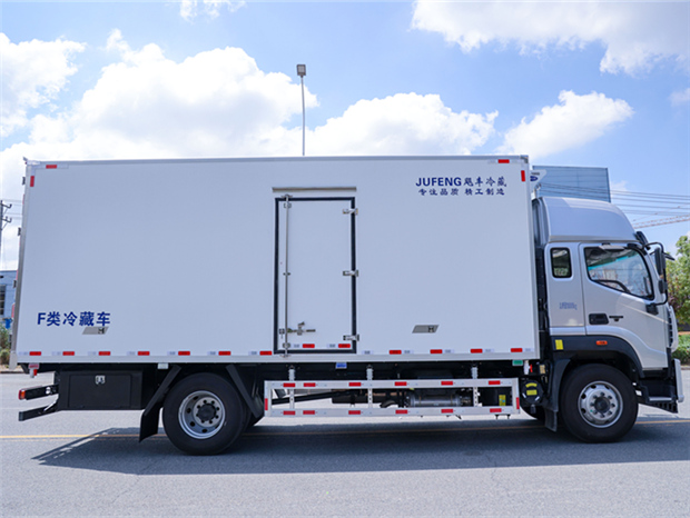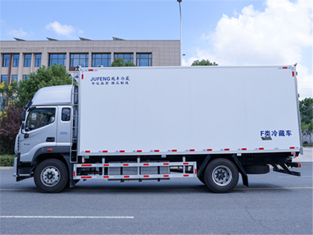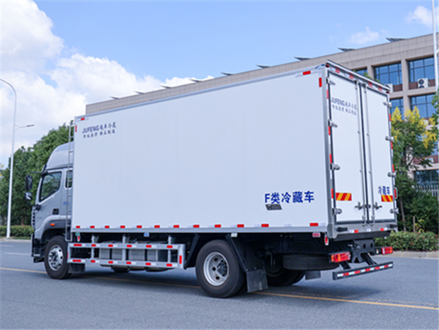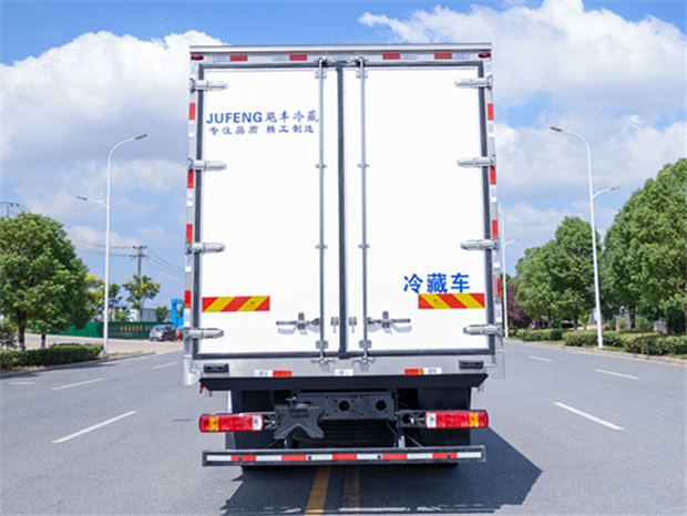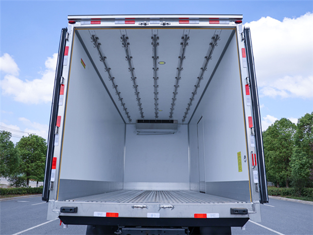 歐航6米8冷藏車廂體配置為:斷橋隔溫工藝,整體結構框架,內外面料為3mm新款啞光玻璃鋼夾保溫層真空復合而成,廂體厚度為8cm,最新款鋁合金包邊型材,型材局部厚度為4mm(鋼制鉚釘加固),廂體內部采用2個LED照明燈及廂體示寬燈,后門框不銹鋼材質,門框密封條為三元乙丙橡膠材質,加厚型不銹鋼合頁及鎖件;副梁為Q700車用大梁鋼,15mm厚大梁墊皮,加裝防撞膠塊,不銹鋼門鎖件,配后雙開門,副駕駛一側居中靠前開單側門一個,帶2個排水孔。